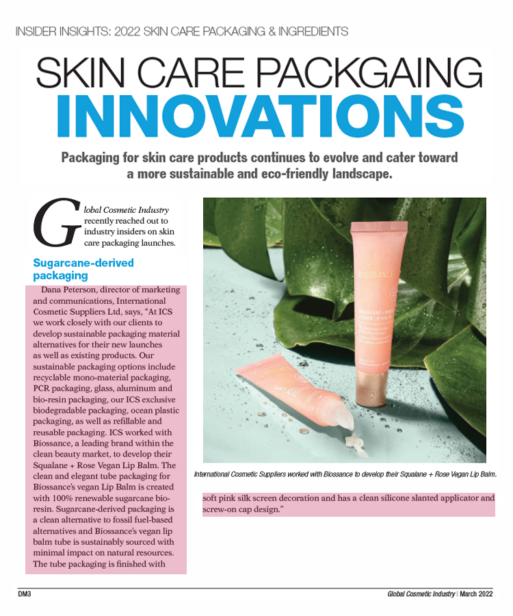 ICONS|ICS has been featured in Global Cosmetic Industry’s March 2022 Issue! Featuring our contribution to their ‘Skincare Packaging Innovations’ article, where our Director of Marketing and Communications, Dana Peterson, talks about our collaboration with Biossance, a leading brand within the “clean” beauty market, to develop their Squalane + Rose Vegan Lip Balm.