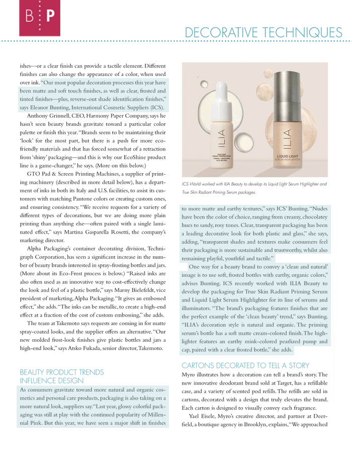 ICONS|ICS have been featured in Beauty Packaging Magazine’s December 2019 Issue on “Deco That Tells a Brand’s Story”, where our Marketing Manager, Eleanor Bunting, talks about our collaboration with Ilia Beauty, a brand on a mission to deliver clean and sustainable products.