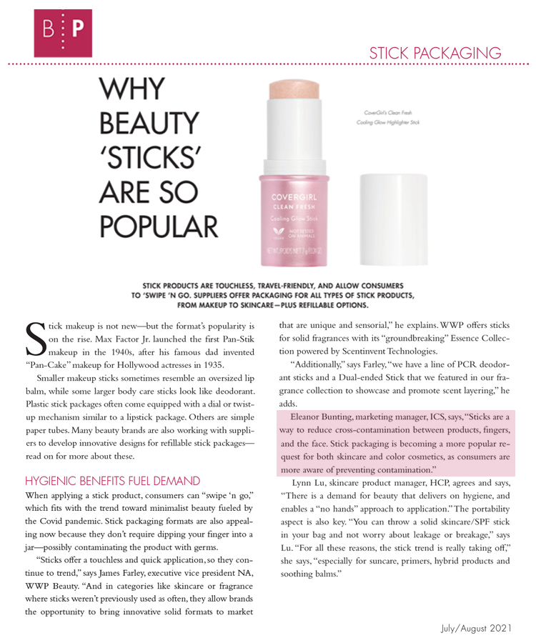 We have been featured in Beauty Packaging’s July/August Issue! Featuring our contribution to their Stick Packaging article ‘Why Beauty ‘Sticks’ are so Popular’, where Marketing & Communications Manager, Eleanor Bunting, discusses the hygiene benefits of Sticks and marketing Sticks to the male consumer, discussing trends of male beautification, featuring our development of “The Blur Stick” by Hims, and also topics of sustainability.