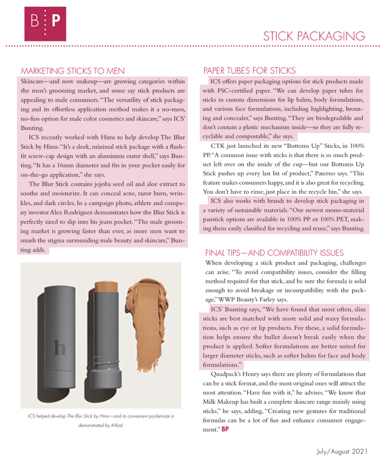 ICONS x Hims featured in Beauty Packaging ‘Why Beauty Sticks are so Popular’ Story July/August 2021 Issue