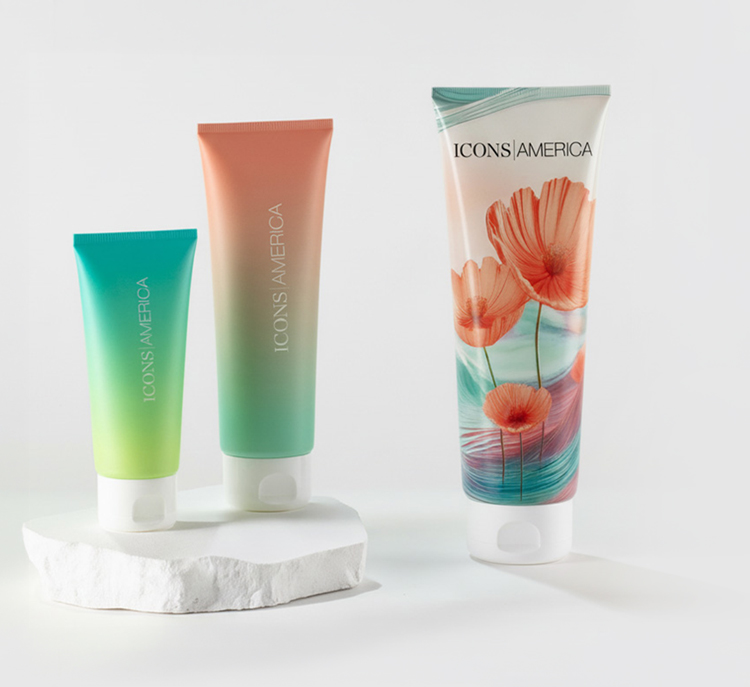 ICONS America In-Mold Label (IML) tubes allow unlimited graphics, from shoulder to crimp, creating a panoramic canvas that transforms your tube into a work of art. Sustainable: on-shore USA manufacturing, recyclable, mono PP, available with PCR.