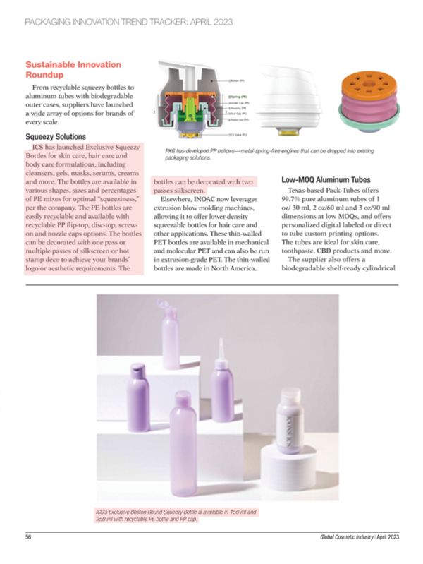 ICONS Squeezy Bottles featured in Global Cosmetic Industry’s ‘Packaging Innovation Trend Tracker’ April 2023 Issue